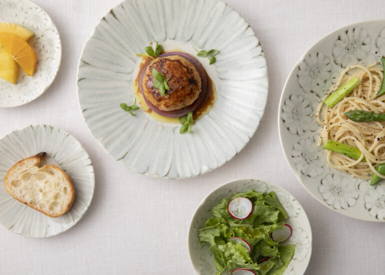白いお皿に白い花のモチーフを。大胆な花柄が描かれつつも白を基調にしており、料理が華やかに見えるようなデザインです。洋食によく合うデザインで、サラダやフルーツなど